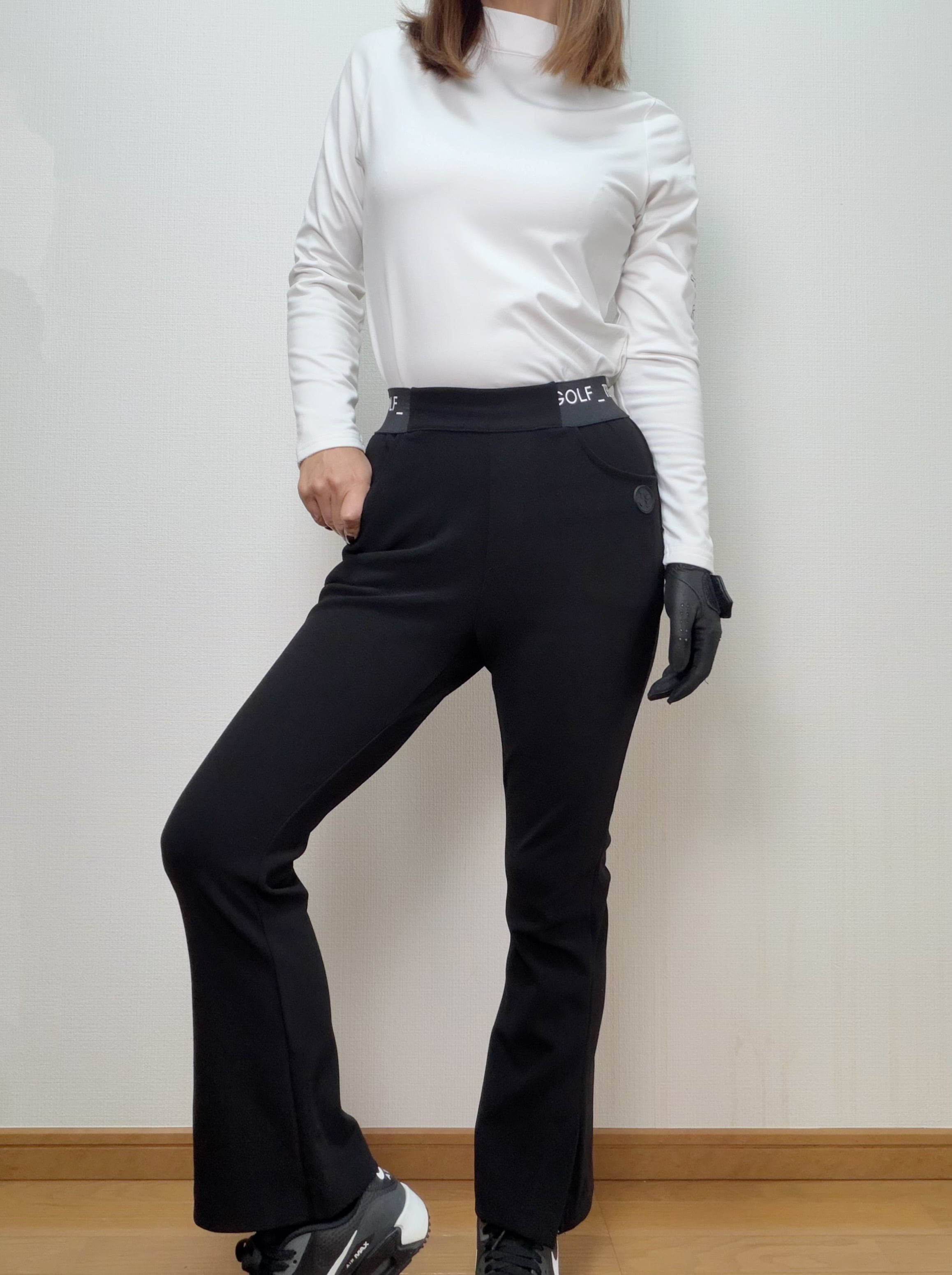 ストレッチ性のあるサラッと軽やかな素材を使用したタイトフレアパンツ。ウエストゴムで快適なフィット感。前後ポケット付きD管付きで実用性も◎。
