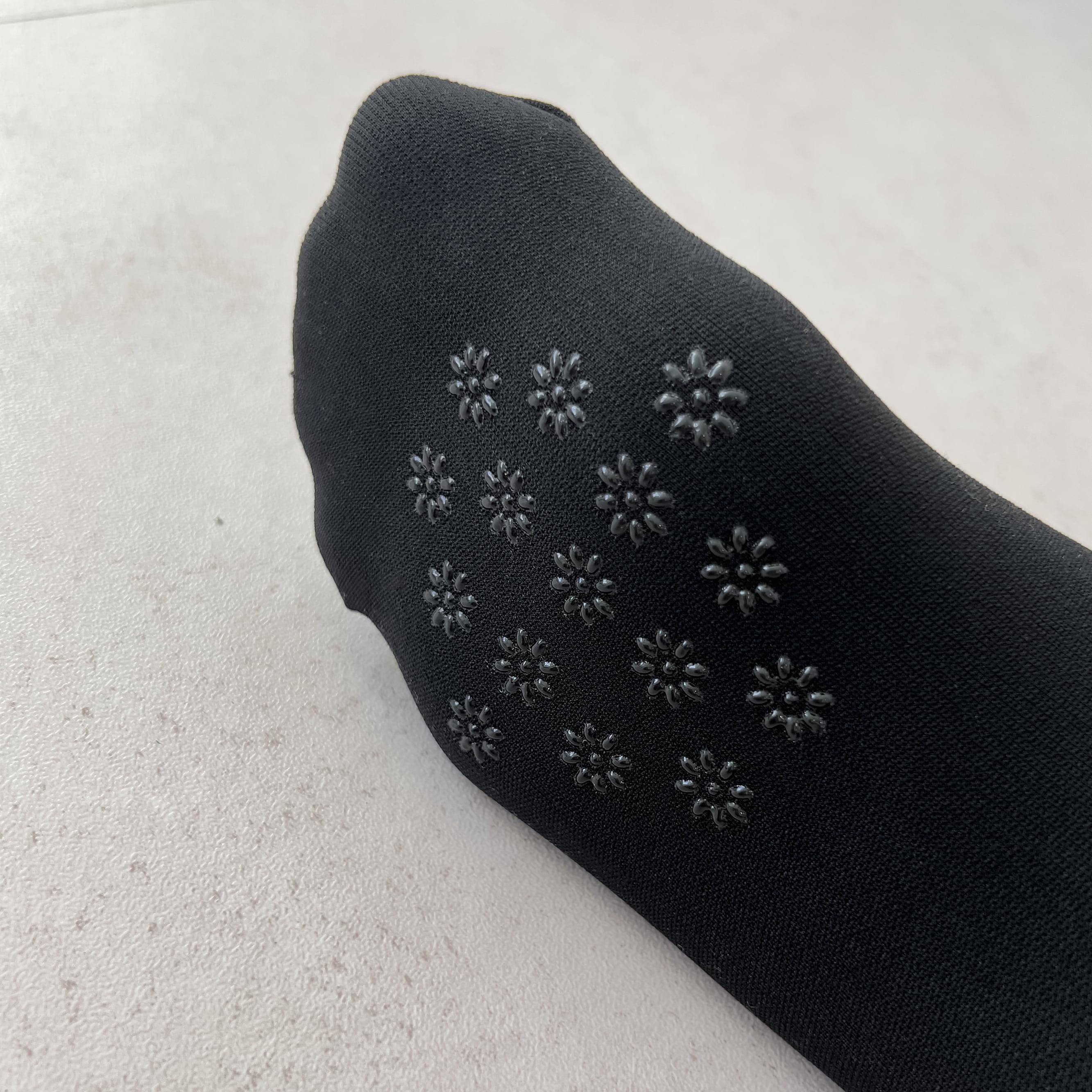 UV加工、伝線が広がらない織り方をしています。肌色部分は200デニール、ソックス部分は300デニールです。