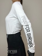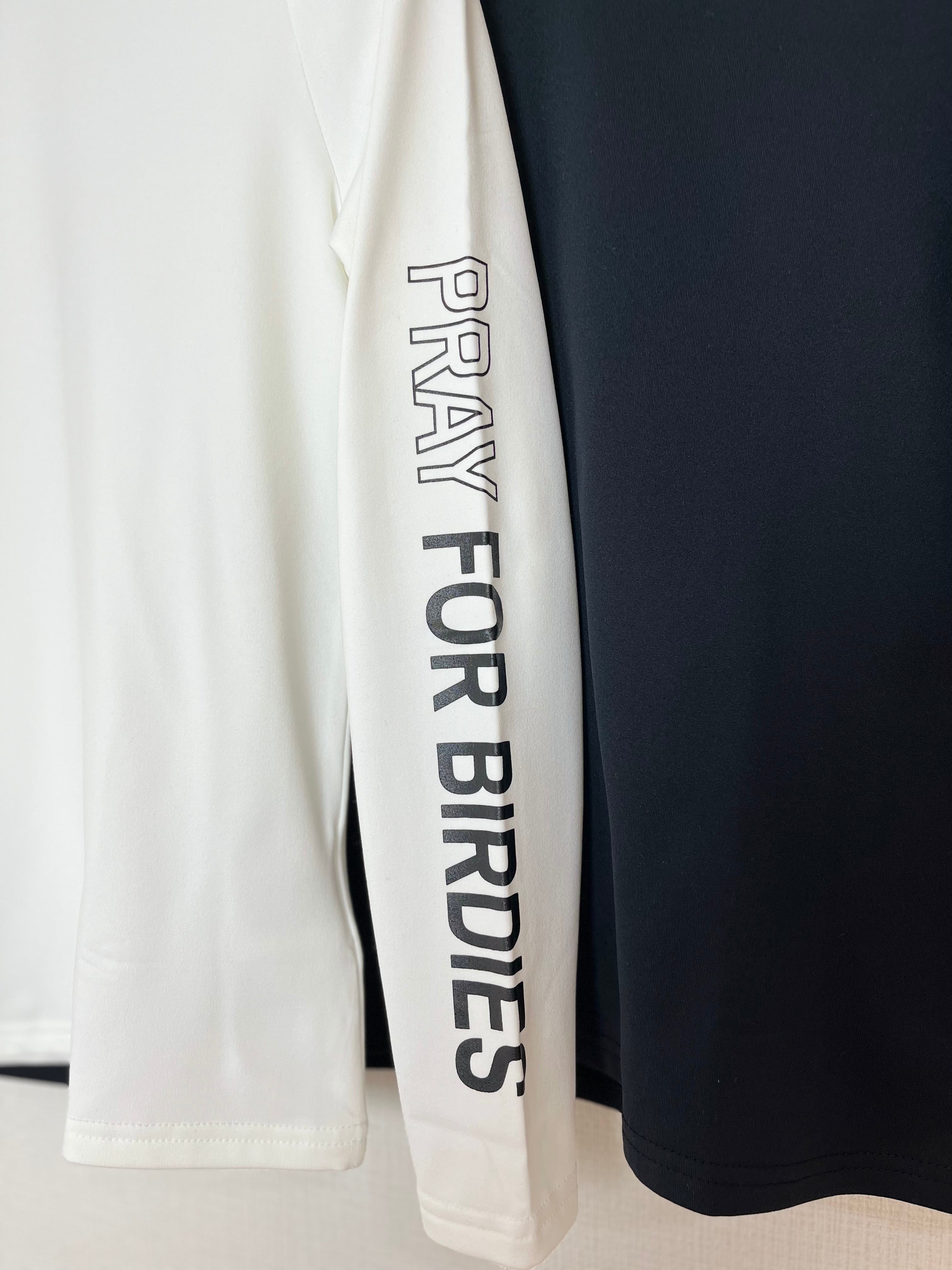 首元のギャザリング、袖の「PRAY FOR BIRDIES」ロゴもポイントです。