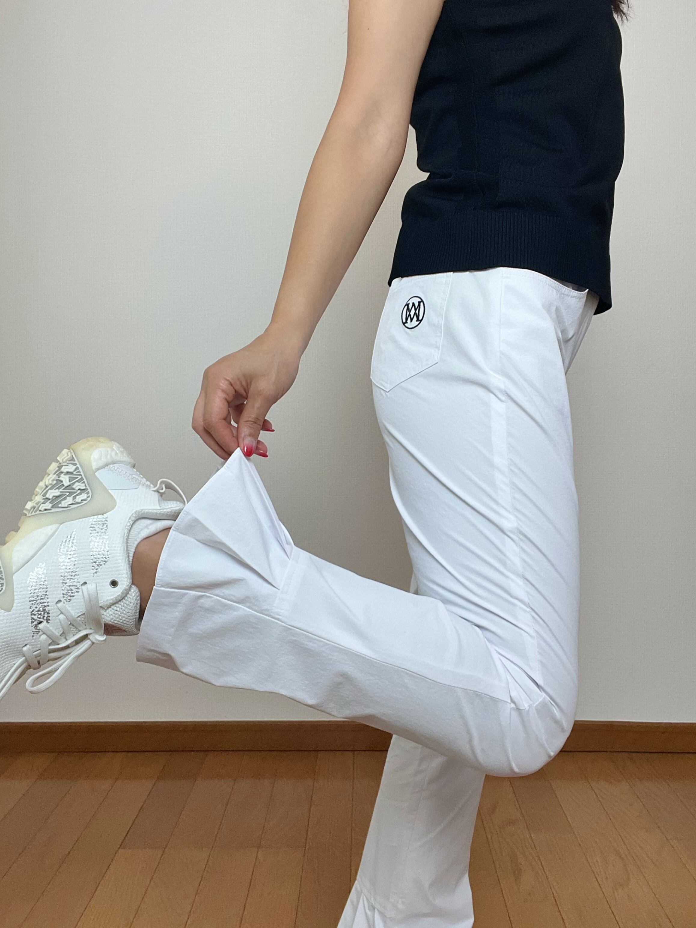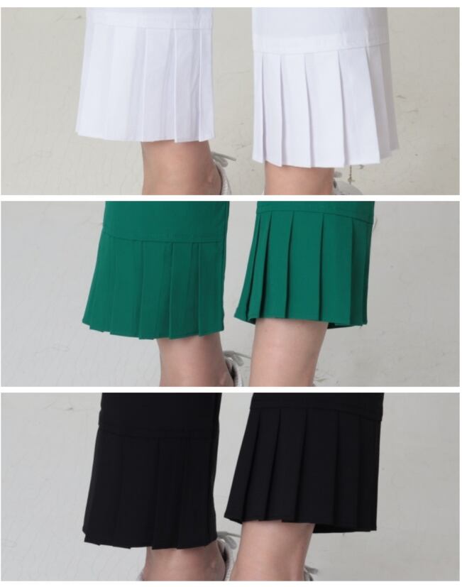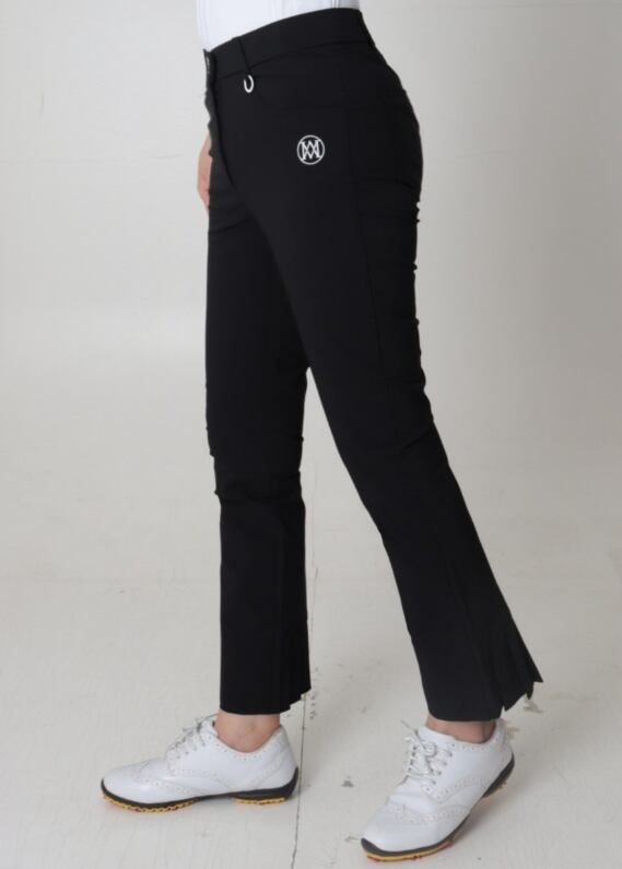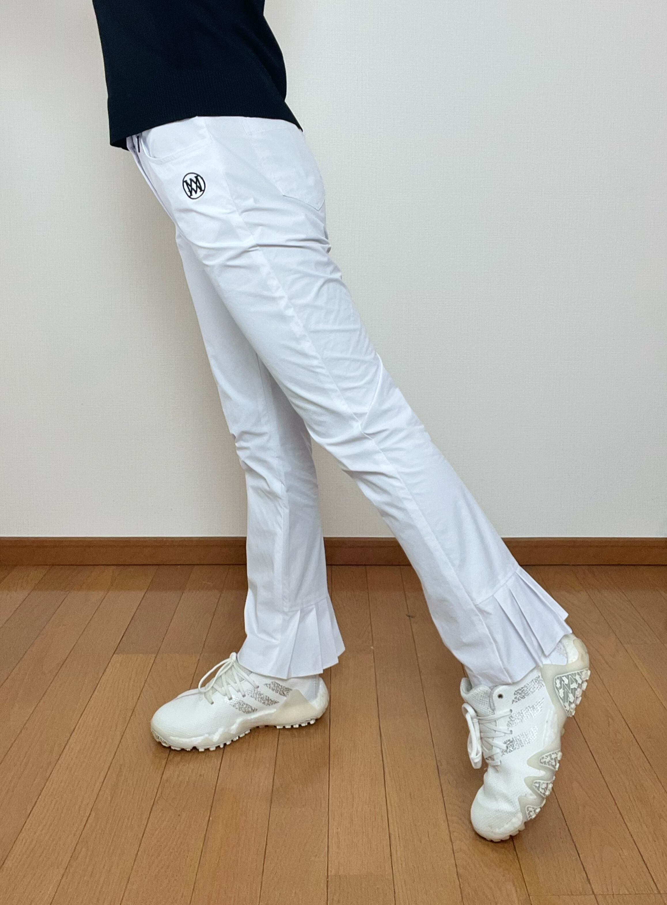 ほのかなブーツカットシルエットで、足元をスッキリ美脚効果ありパンツ。バックに配された裾プリーツは足首に抜け感を演出します。